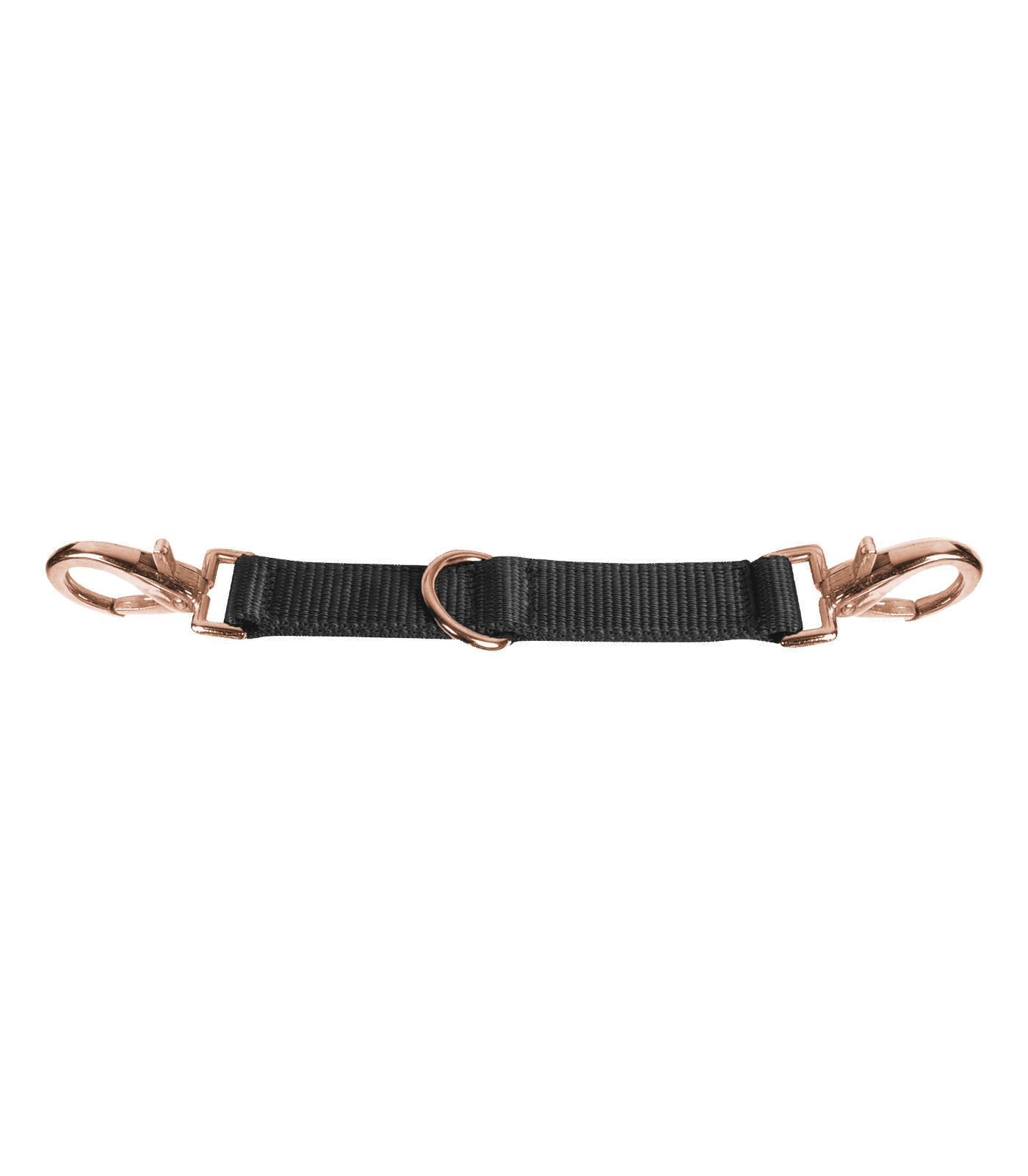 Style sobre et élégant avec bouclerie rose gold, équipée de deux mousquetons et d’un anneau en D central.