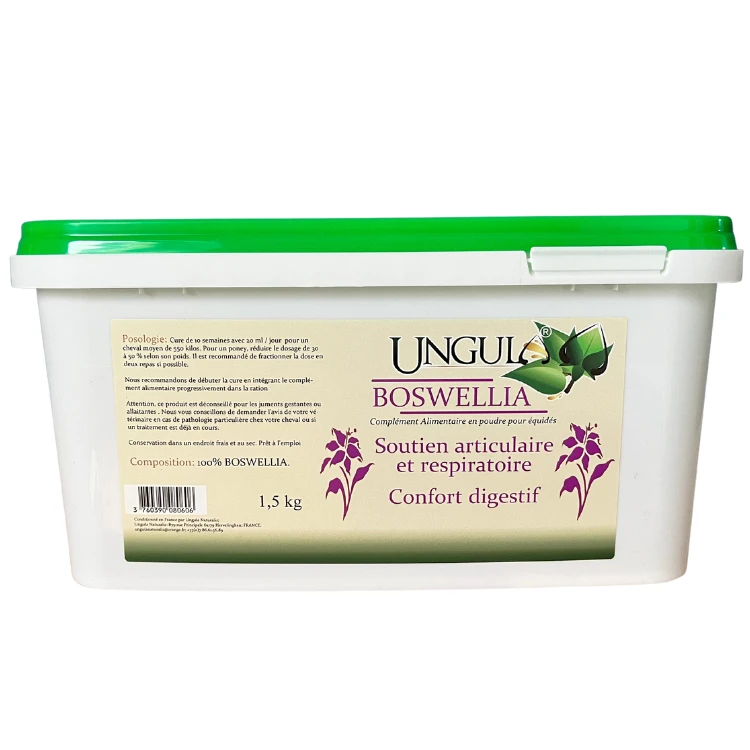 Complément naturel en poudre à base de Boswellia serrata pour chevaux, favorisant la mobilité, soulageant les douleurs articulaires et soutenant la santé respiratoire et gastrique !