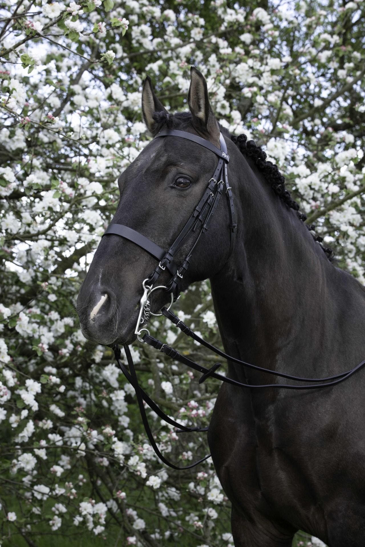 Fabriqué en cuir de buffle teinté noir à cœur, il dispose d’une muserolle française plate de 3 cm de large et d’un frontal plat pour un style sobre et raffiné.
