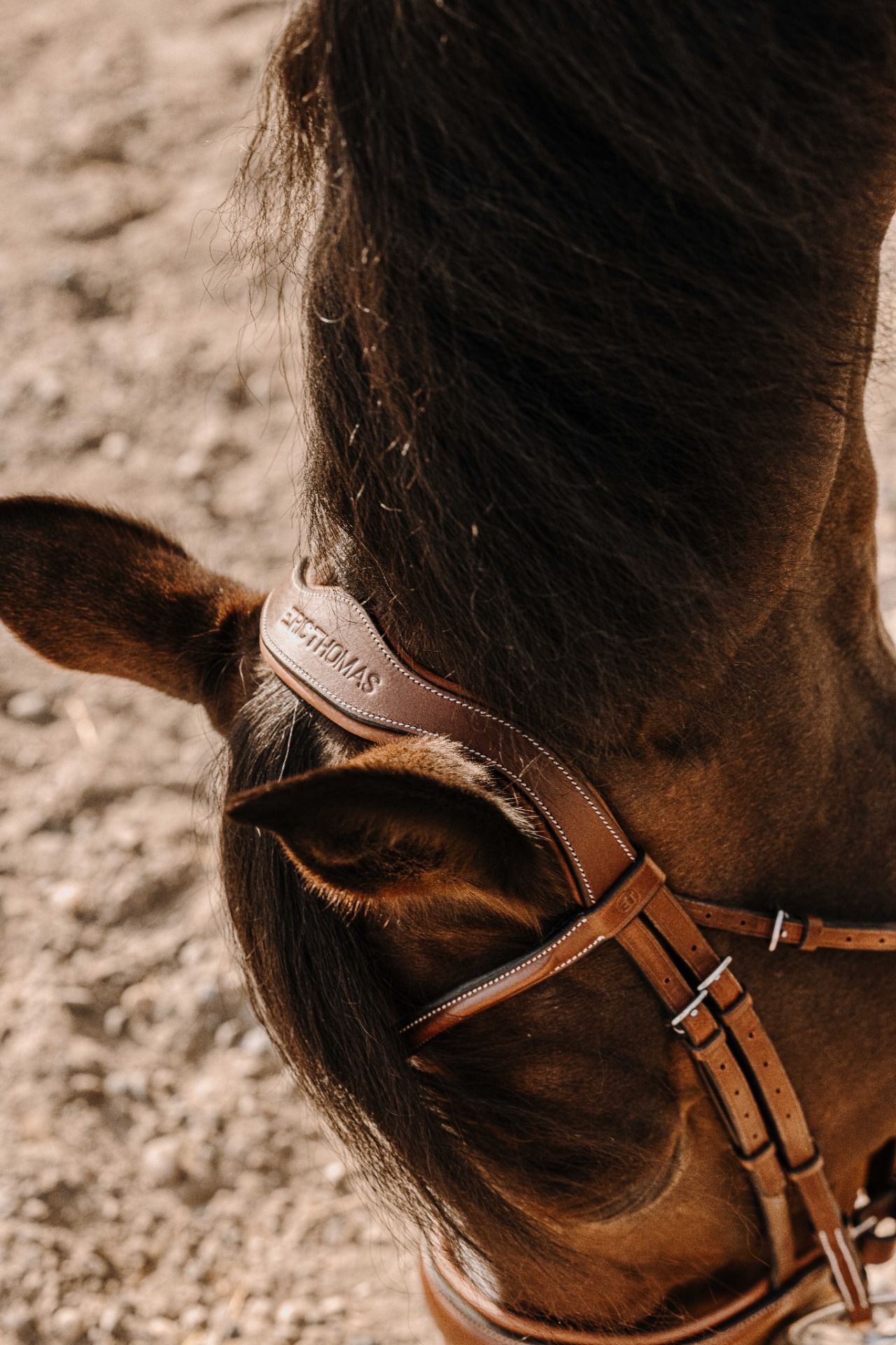 Bridon en cuir de buffle aniline avec frontal galbé et muserolle suédoise, doublés de clarino pour confort et élégance !