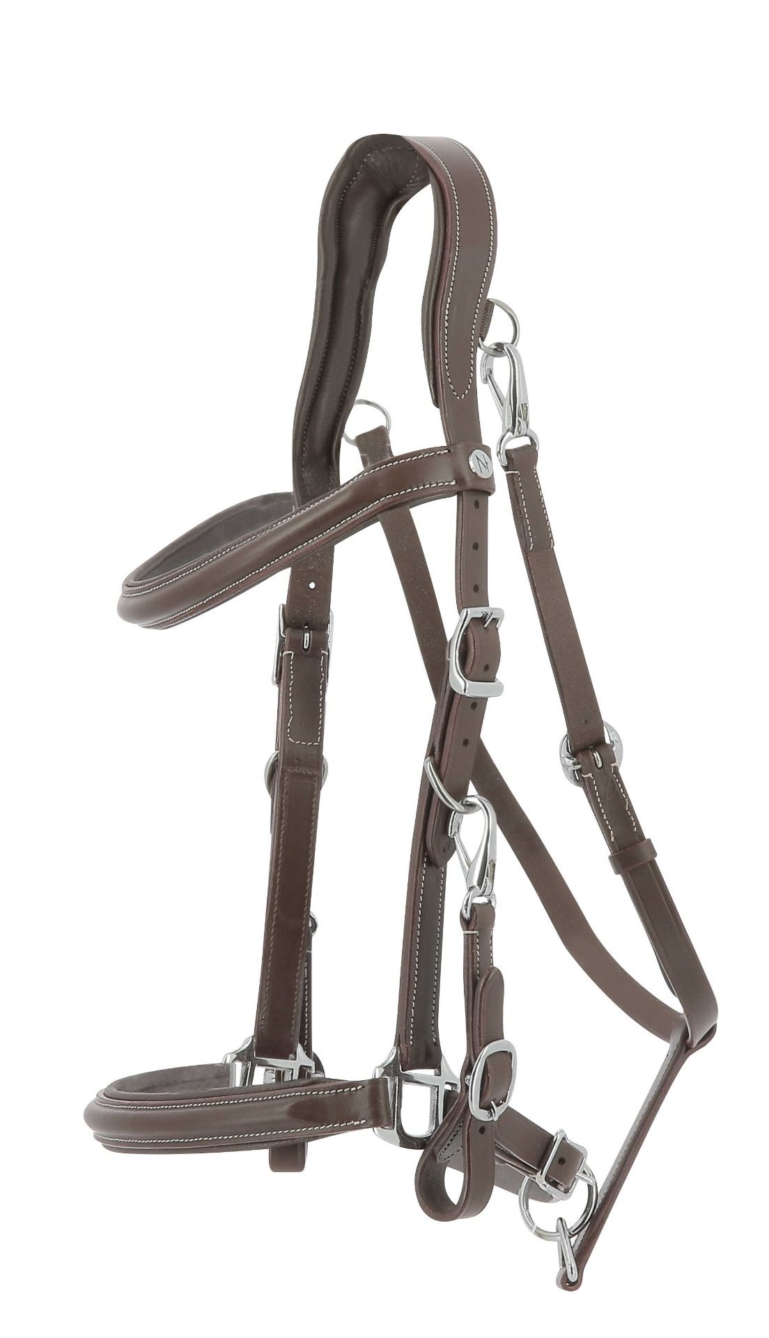 Parfait pour la randonnée ou le trec, ce bridon à double utilisation se transforme facilement en licol grâce à ses montants détachables par mousquetons.