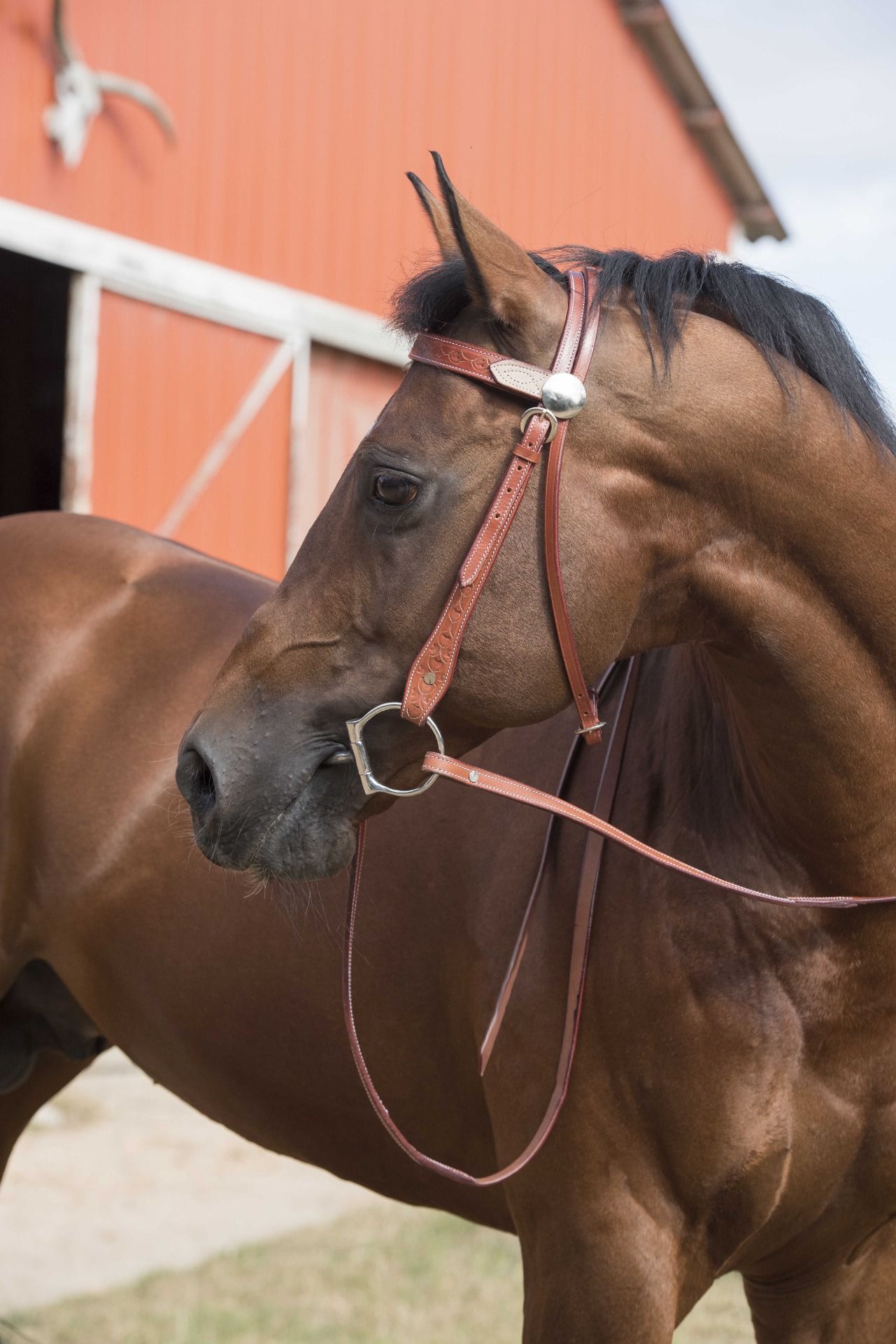Bridon western en cuir de buffle avec motif plumes, surpiqûres blanches, renforts contrastés et rênes lisses. Bouclerie en laiton nickelé, fermeture par vis !