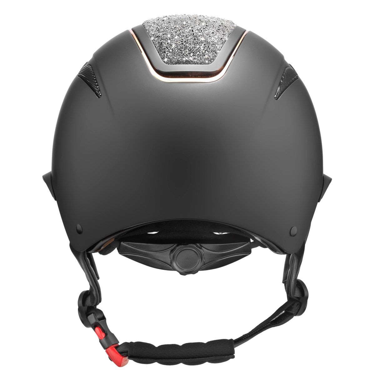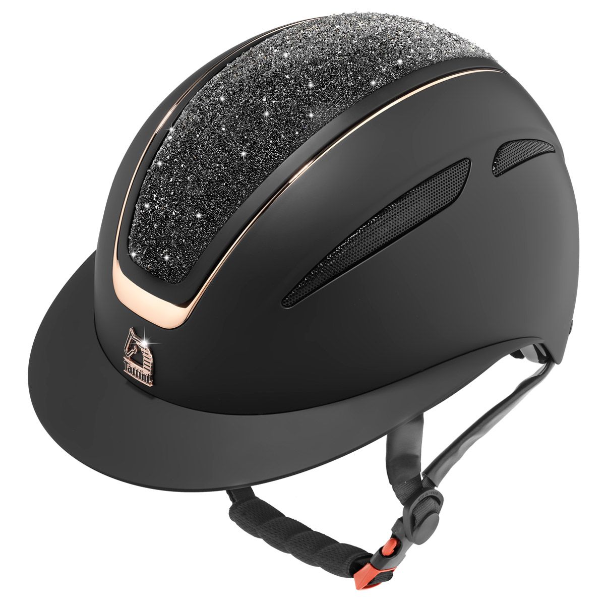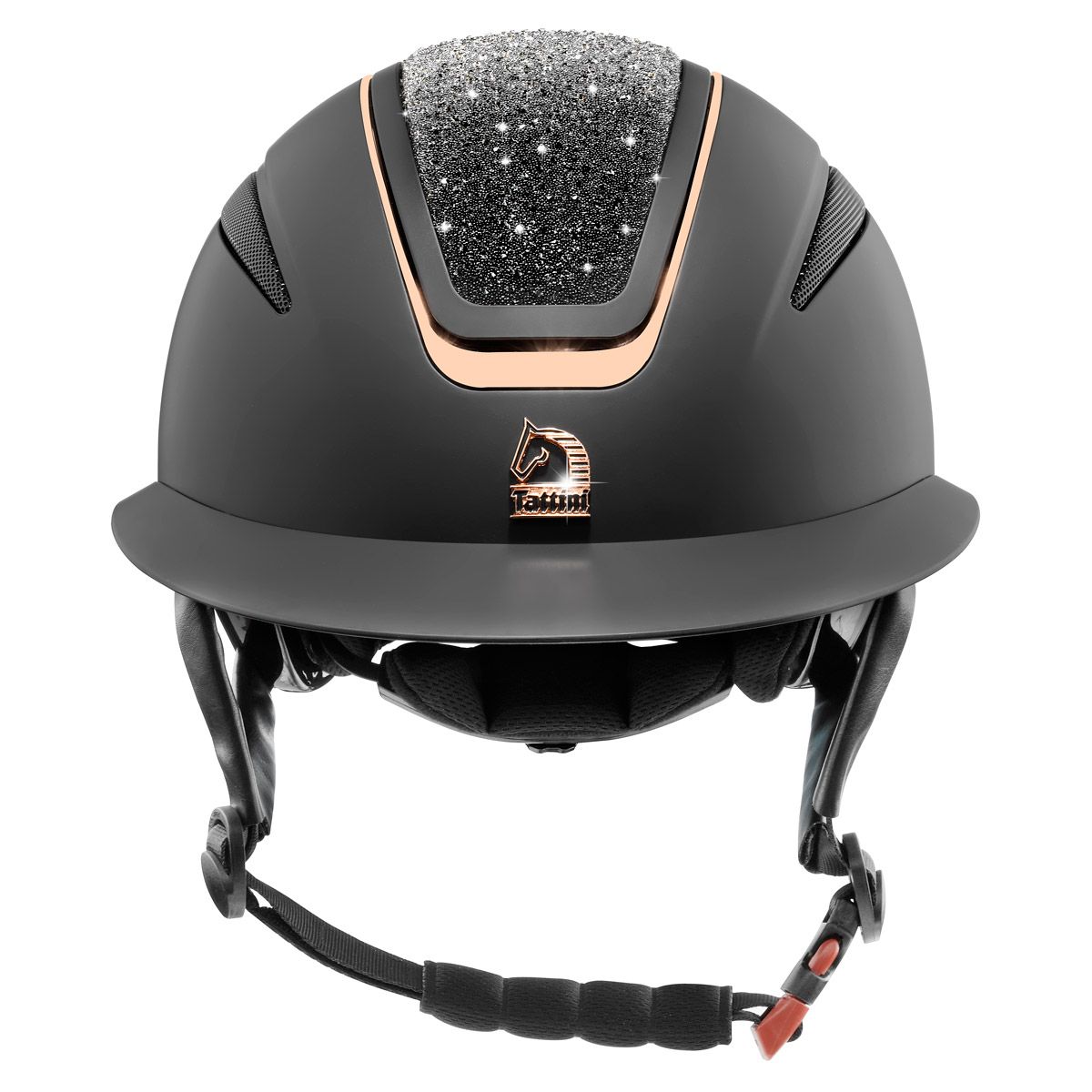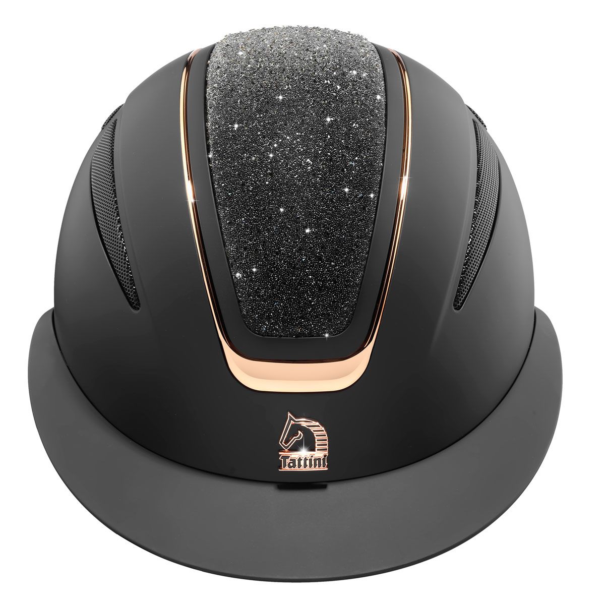 Le nouveau casque de luxe Tattini avec profils brillants or rose, doté d’une plaque super brillante avec cristaux et d’une toute nouvelle personnalisation : le logo Tattini profilé or rose.