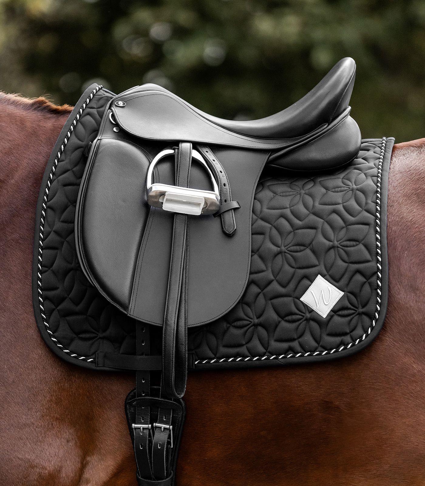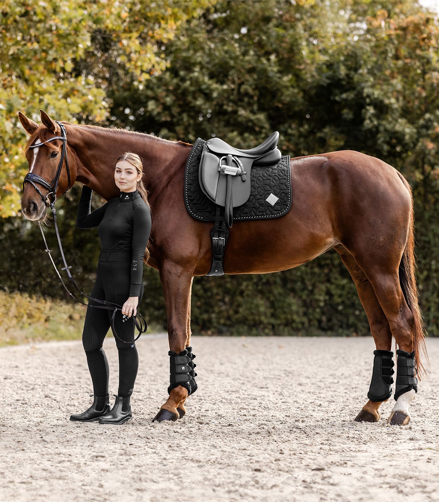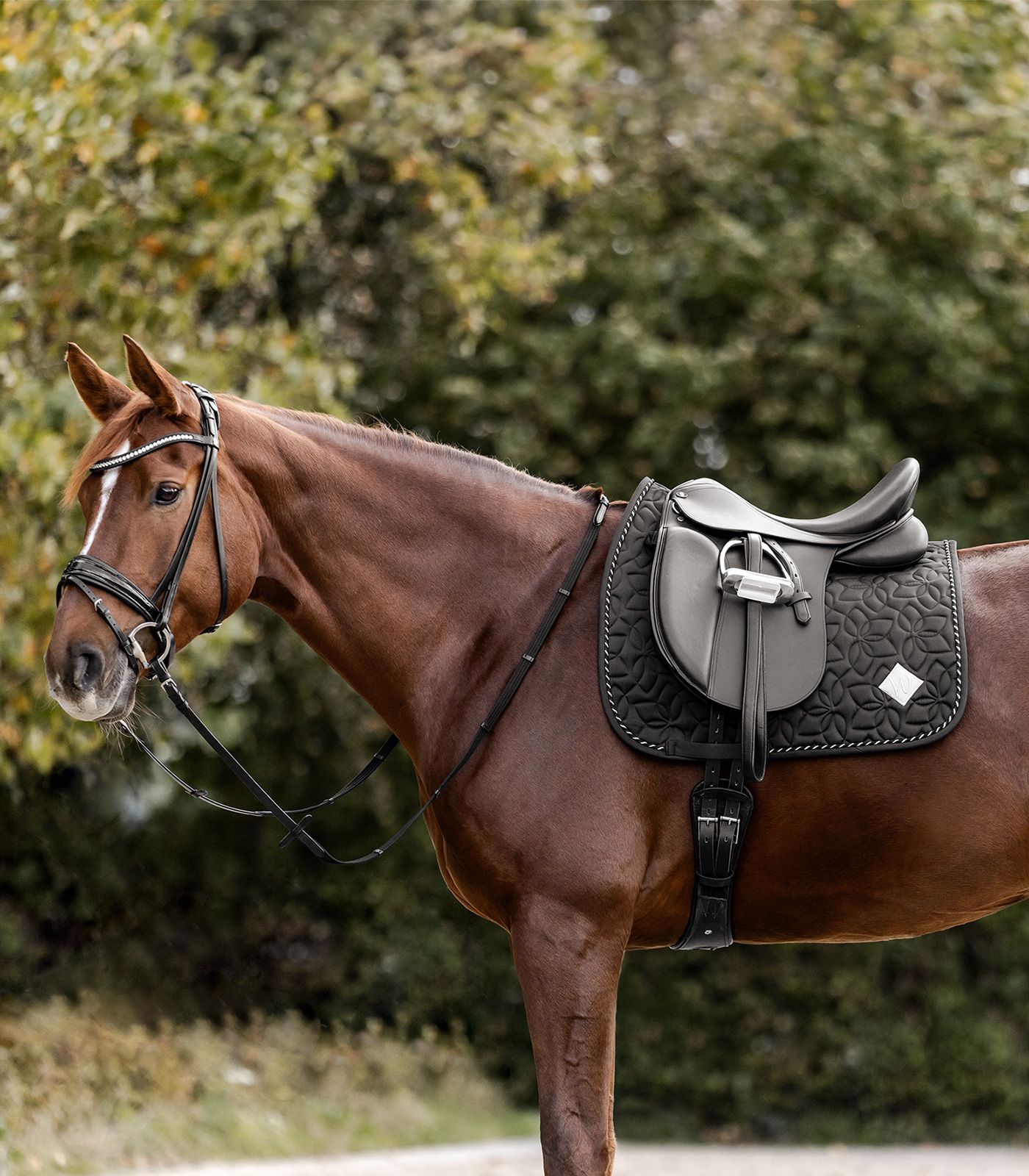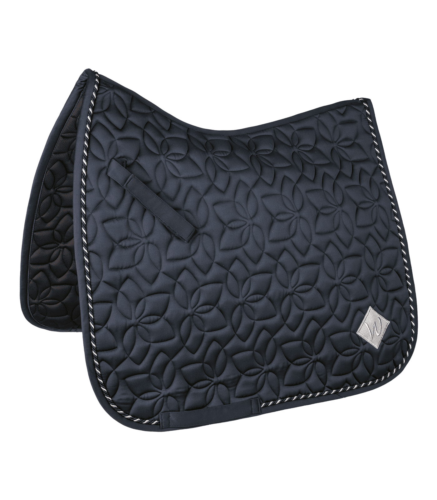 Le tapis de dressage parfait pour briller aux écuries. - Élégant : Liseré en cordelette brillante. - Séchage rapide : Doublure en mesh polyester.
