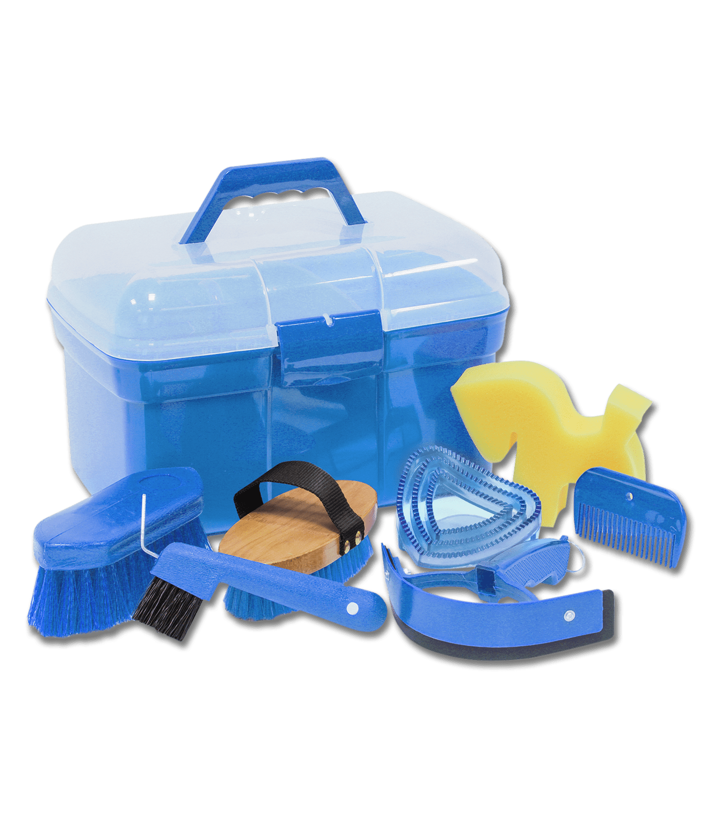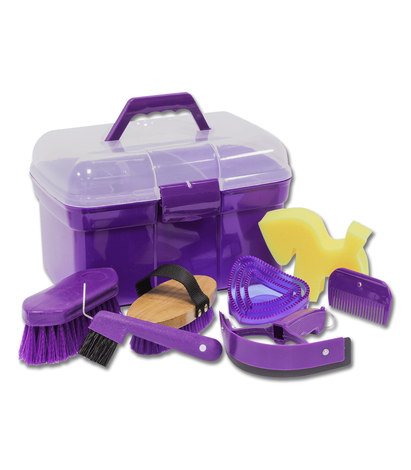 Set de pansage complet dans un joli coffret. Petits compartiments amovibles et poignée. Comprend une brosse, un peigne pour crinière, un cure-pied, une brosse pour crinière, une étrille coeur, un petit couteau de chaleur et une éponge cheval.