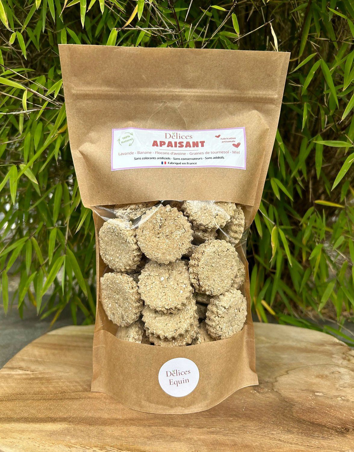 Découvrez nos Délices Apaisant, des friandises pour chevaux naturelles et saines composées de banane, de lavande, de miel, de graines de tournesol, et de flocons d'avoine.