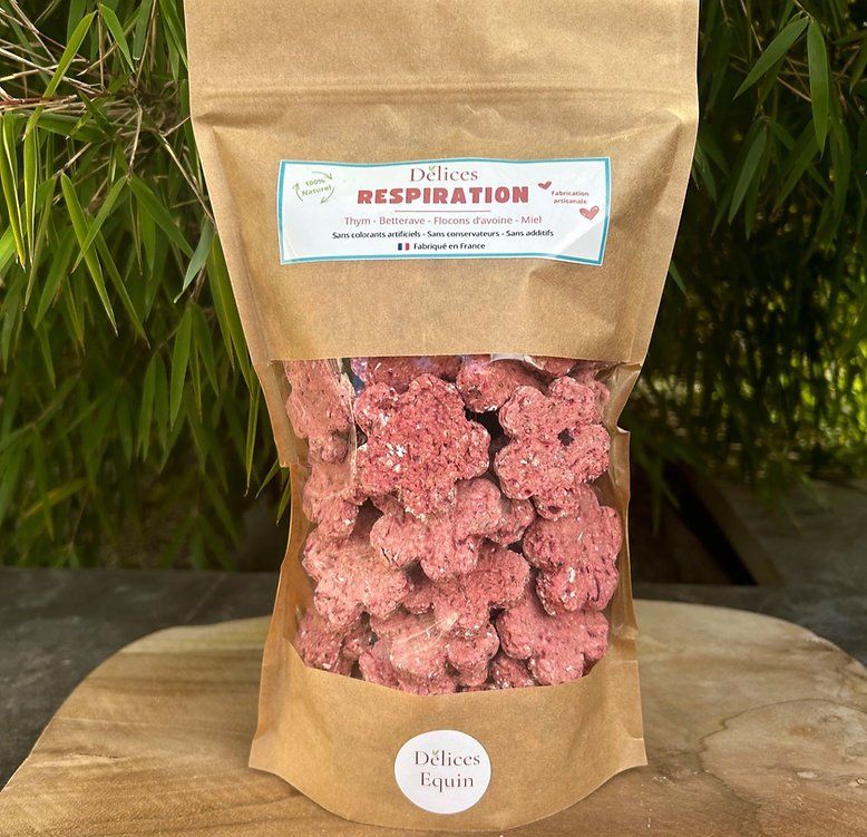 Découvrez nos Délices Respiration, des friandises naturelles pour votre cheval et saines composéesde betterave, de thym, de miel et de flocons d'avoine.