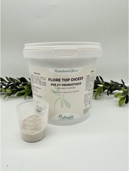 Flore top digest est une source 100% naturelle de prébiotiques et de probiotiques (levures vivantes) qui permet de renforcer et équilibrer le microbiote intestinal du cheval.