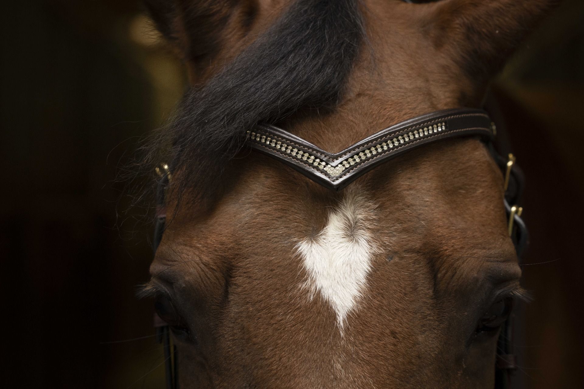 Doublé de cuir souple et matelassé de mousse EVA, il garantit un confort optimal pour votre cheval. Son design en forme de "V" met en valeur la tête, tandis que la double rangée de strass transparents, élégamment assemblés en pointe, apporte une touche chic et raffinée.