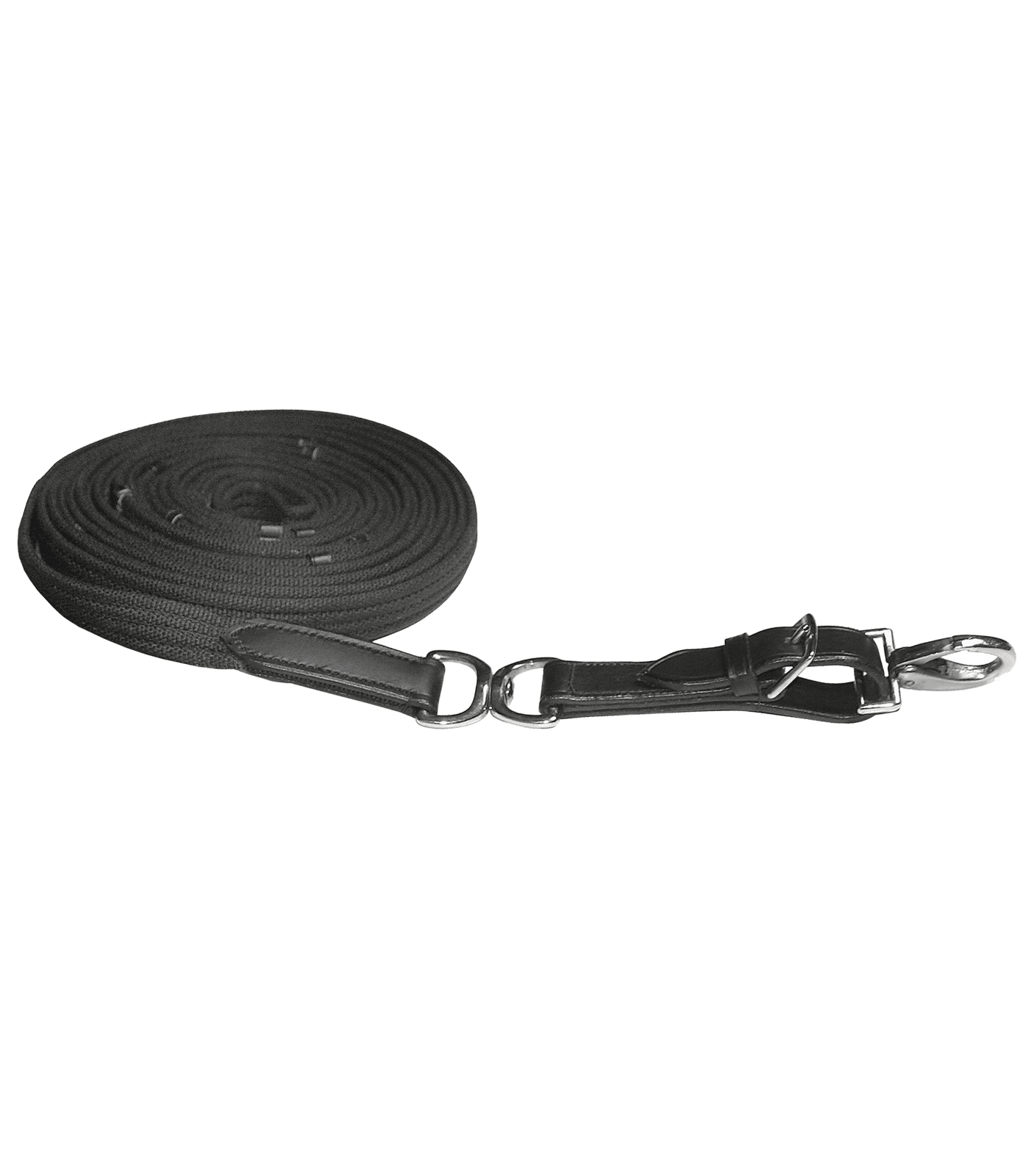 La longe à tourner sangle Waldhausen est équipée d'une poignée d'un côté et d'un mousqueton monté sur une lanière en cuir ainsi qu'un double anneau articulé, côté attache amovible et remplaçable en cas de casse.