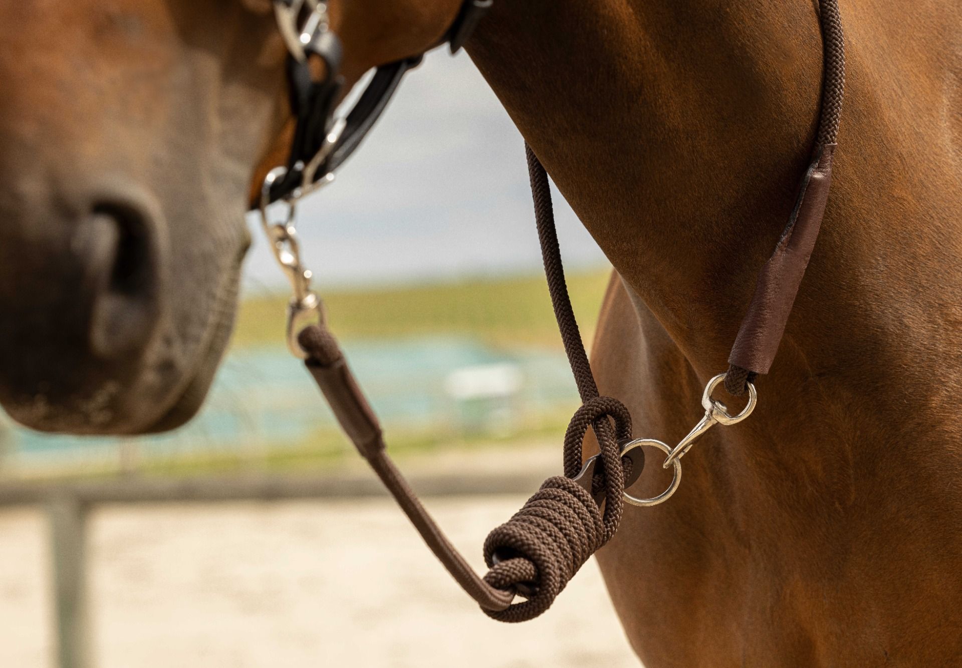Cette longe de 3 m est fabriquée en polypropylène résistant et renforcée par du cuir vachette à chaque extrémité pour plus de solidité. Elle est équipée de mousquetons tournants en laiton massif nickelé pour une utilisation pratique et sécurisée, ainsi que d’un anneau d’attache en inox.