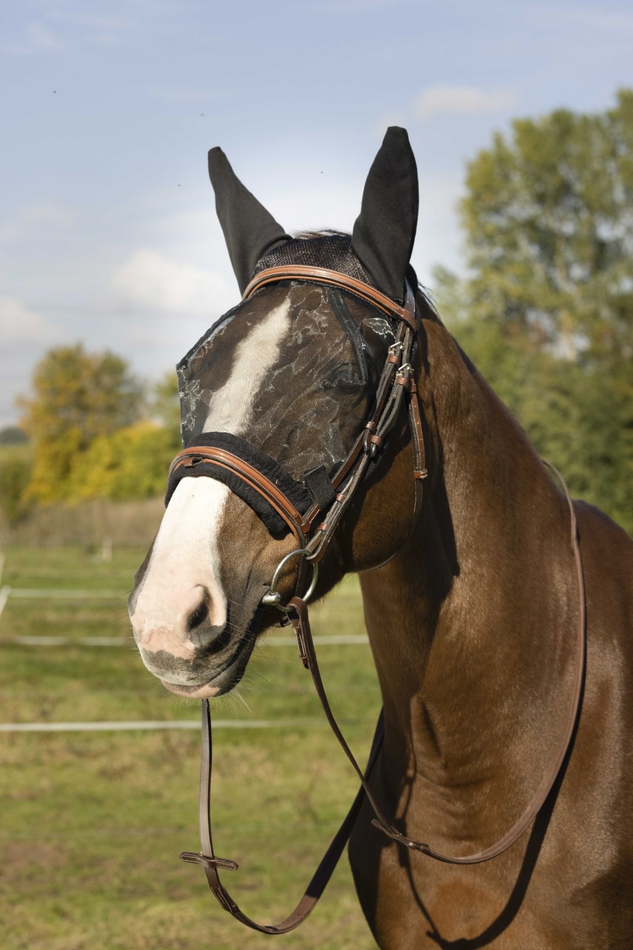 Ce masque est un modèle innovant, mixant un bonnet et un masque anti-mouches avec une partie des oreilles en matière filet et une partie élastiquée, permettant respirabilité et confort.