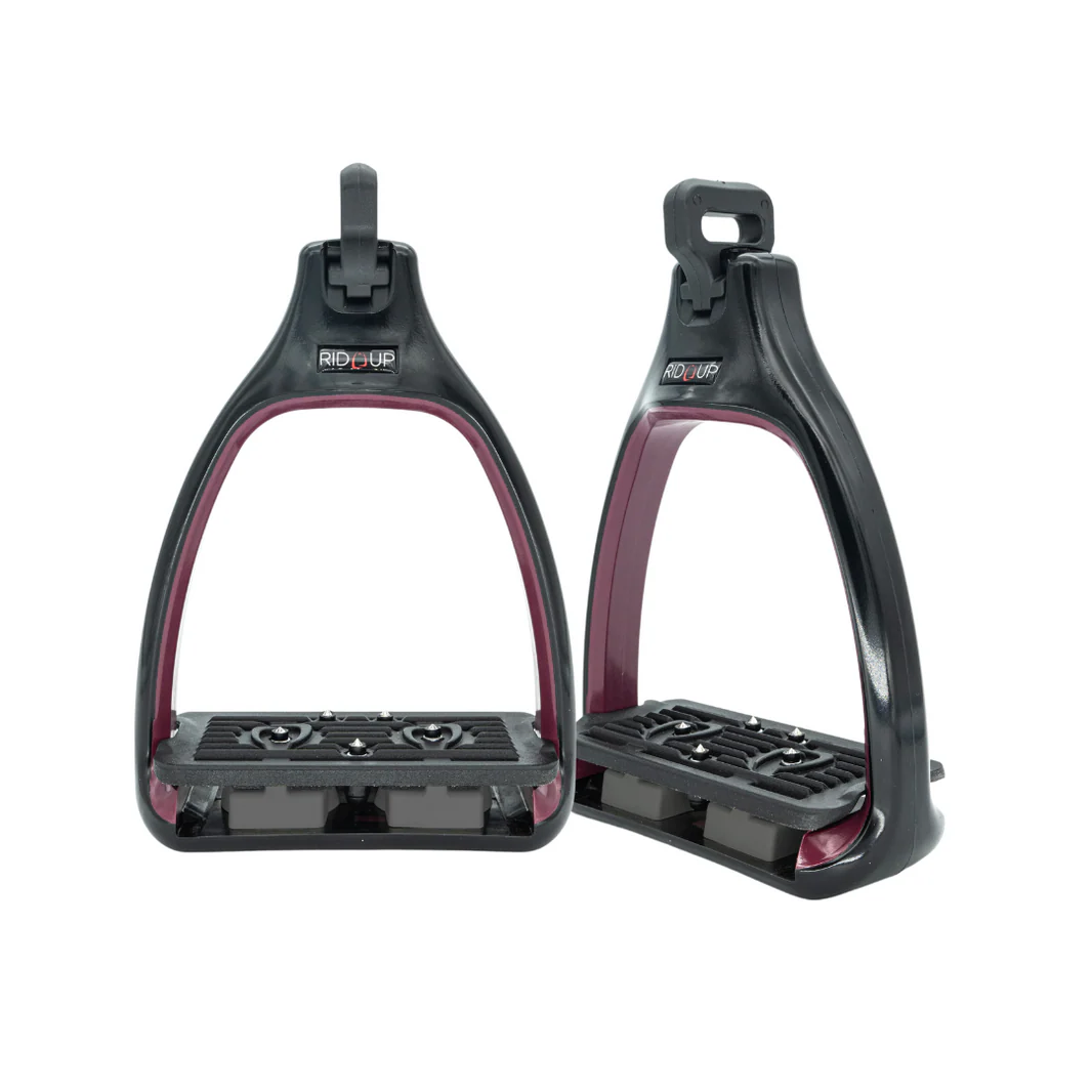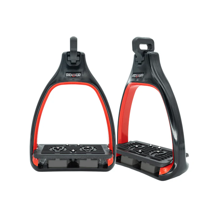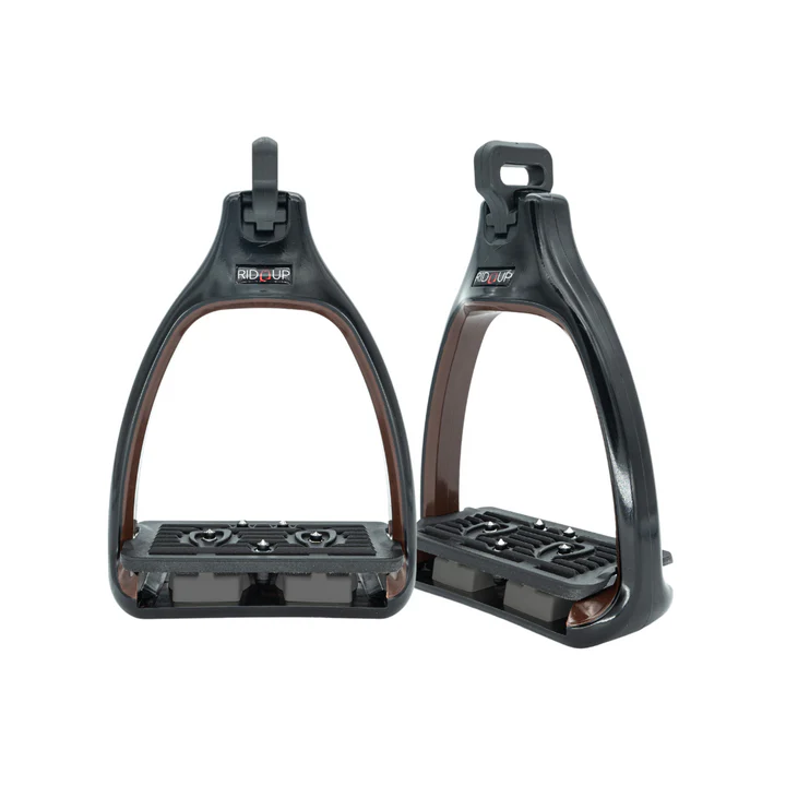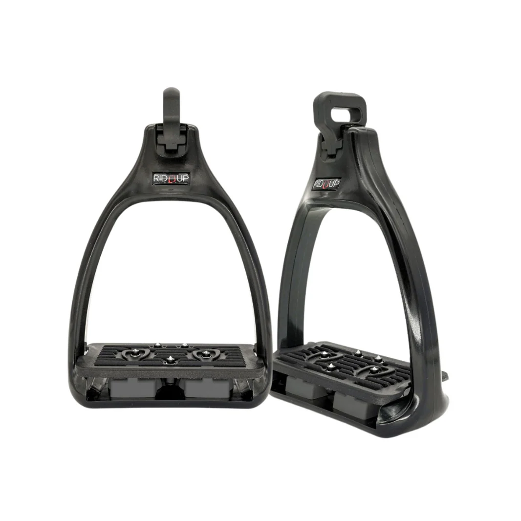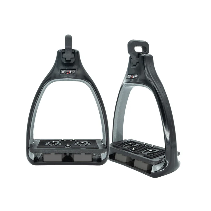Étriers Rid’Up pour l’obstacle, vendus avec housses et boucles supplémentaires, plancher large et strié, grip optimal, système breveté de déclenchement automatique pour sécurité et confort. Fabrication française !