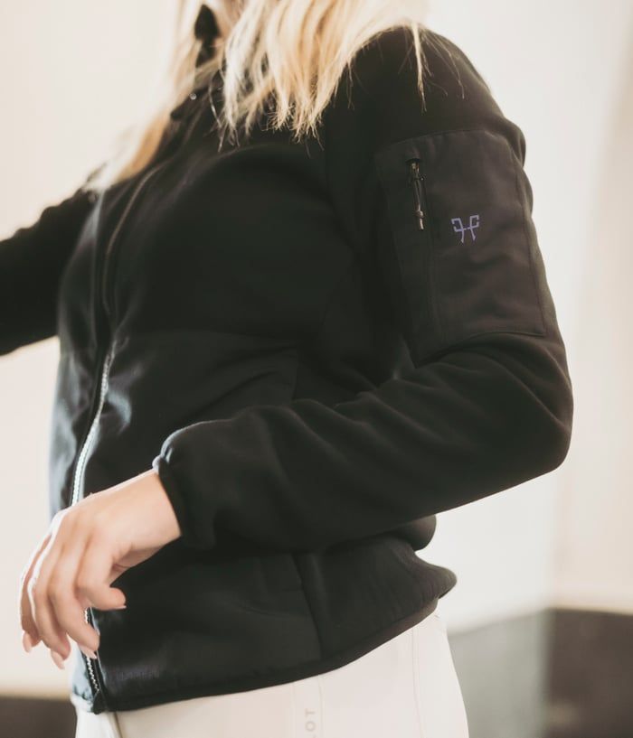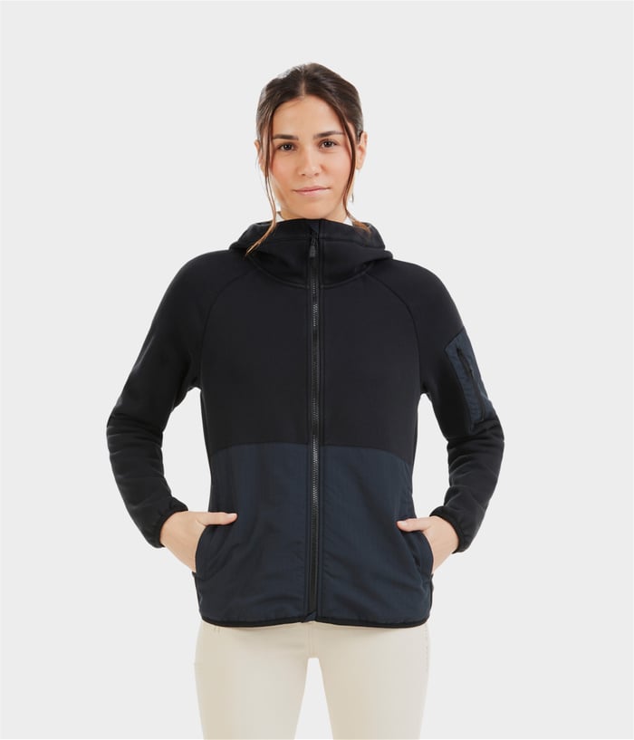 Veste polaire chaude et pratique, idéale pour l’équitation. Capuche clipsable, zip avant robuste, poches mains et bras pour garder vos essentiels à portée de main.