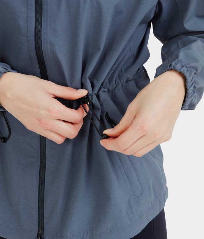 Veste d’équitation légère et imperméable, avec coutures thermo-collées. Capuche non amovible et coupe ajustable qui se ressert à la taille.