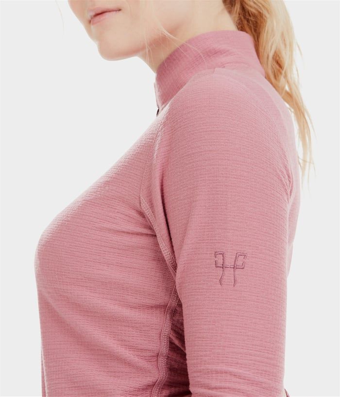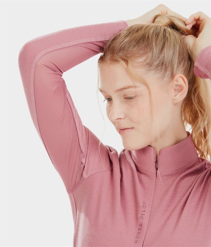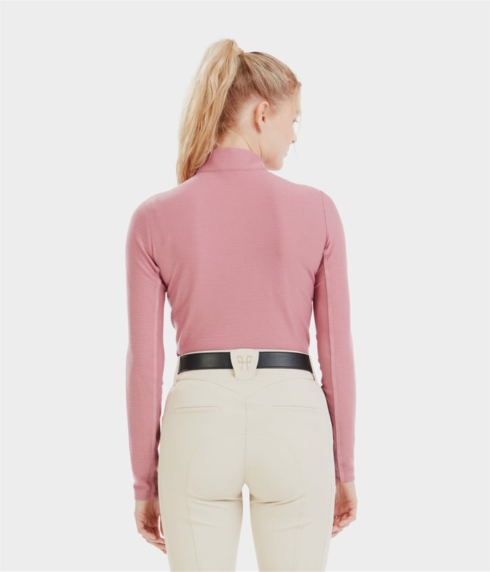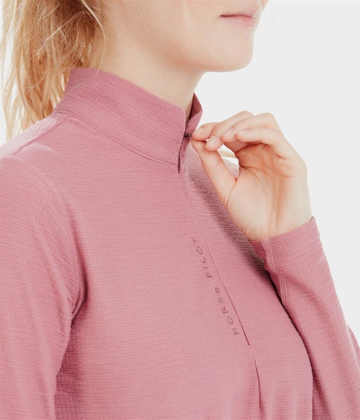 Ce t-shirt à manches longues, léger et respirant grâce au mesh sous les bras, offre une coupe ajustée, un col haut zippé et une matière gaufrée agréable. Idéal pour l’équitation, il protège efficacement des UV.