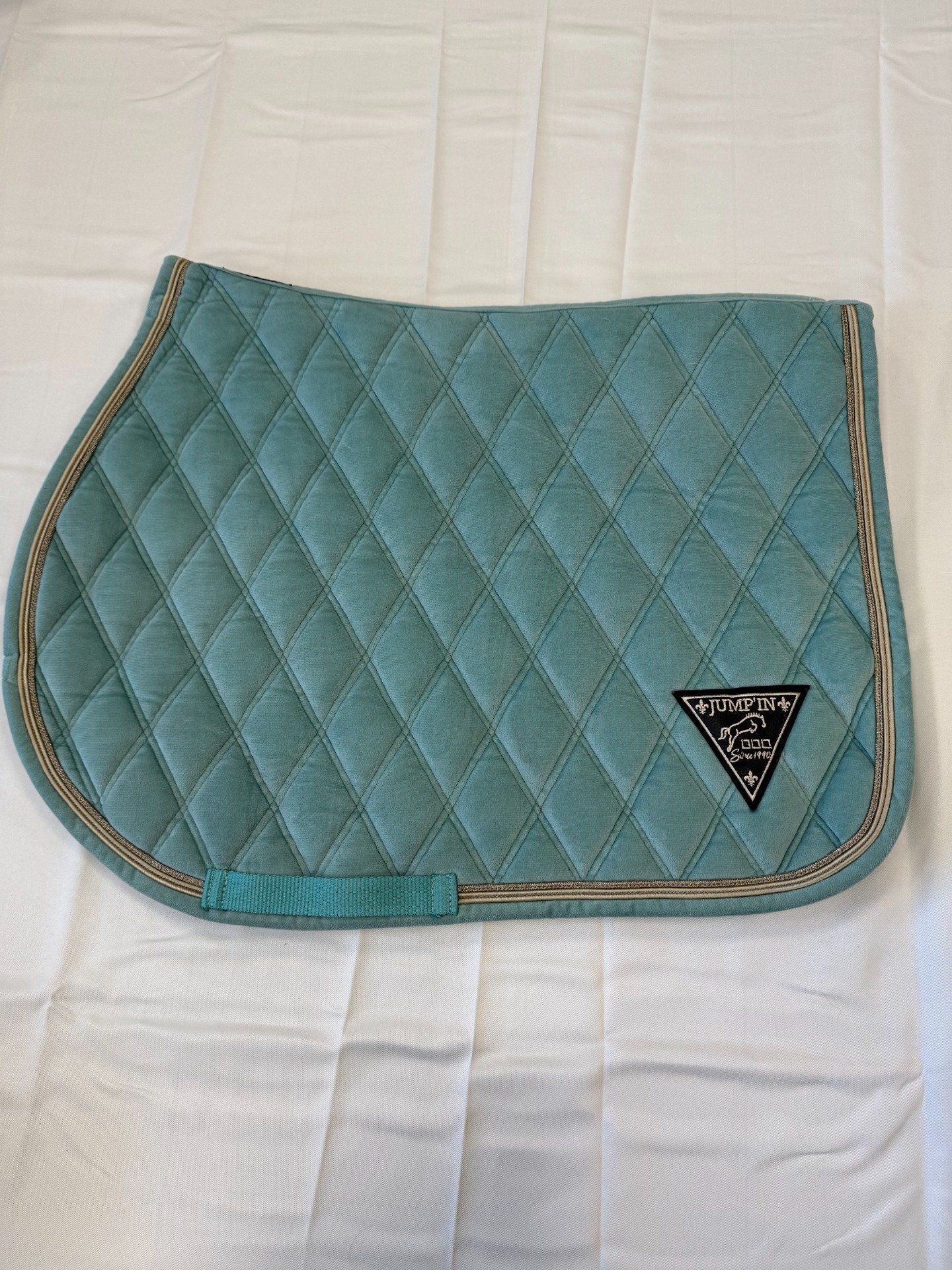 Tapis jumping en matière velours, toujours bien entretenu. Quelques poils blancs persistants dessous, mais état proche du neuf !