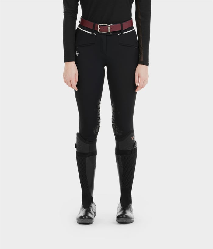 Pantalon d’équitation taille haute avec volume préformé, grip genoux, bas de jambe ajusté et poche téléphone. Stretch, respirant et éco-conçu.